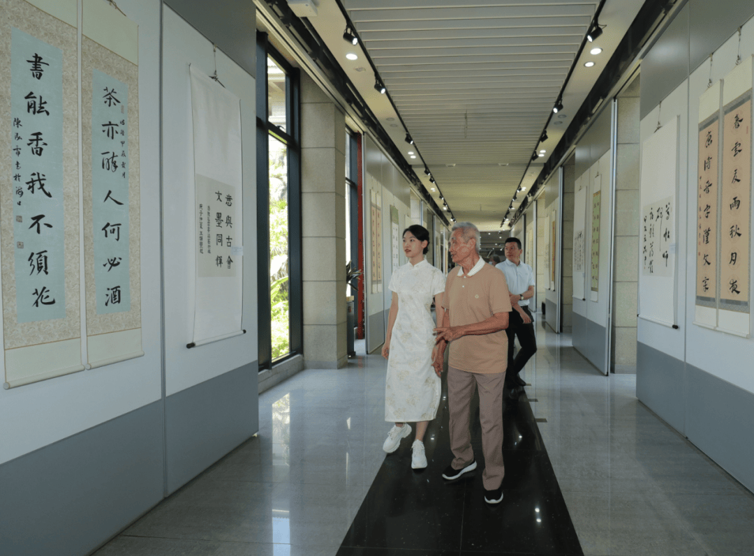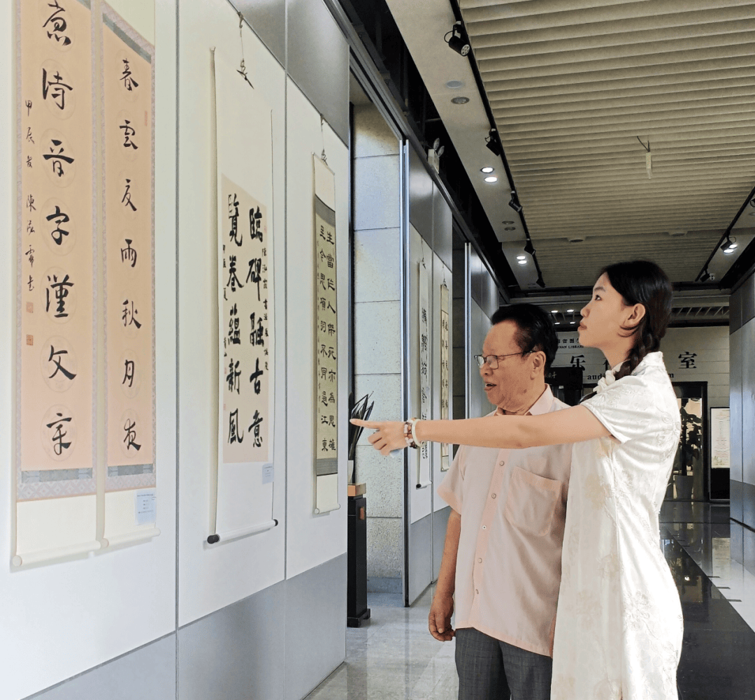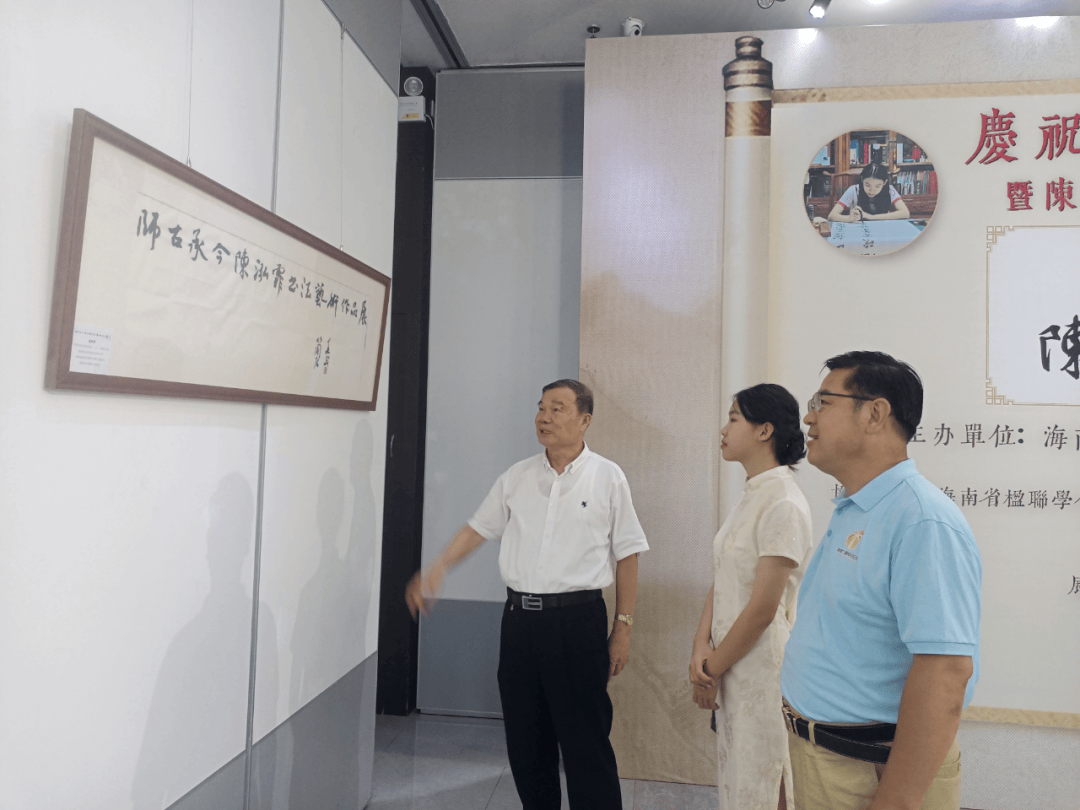 海南省文联原副主席、著名琼剧表演艺术家陈育明观看《师古承今——陈泓霏书法艺术作品展》