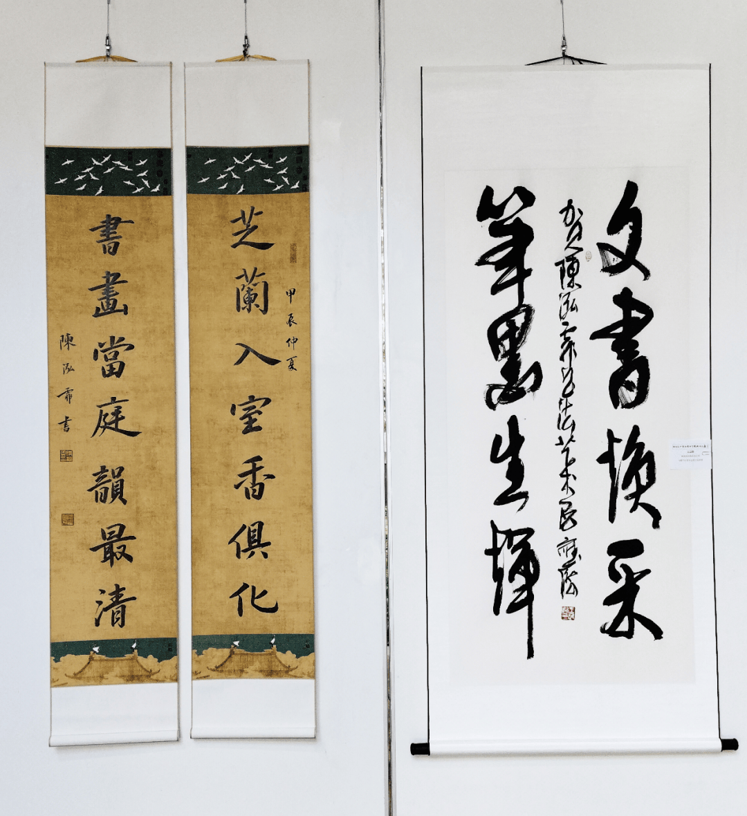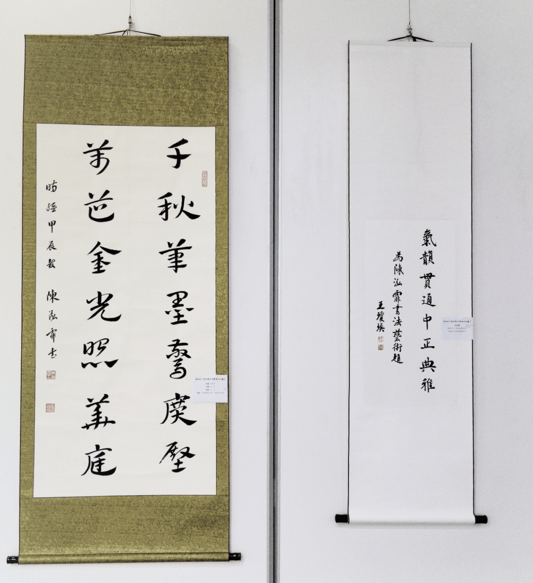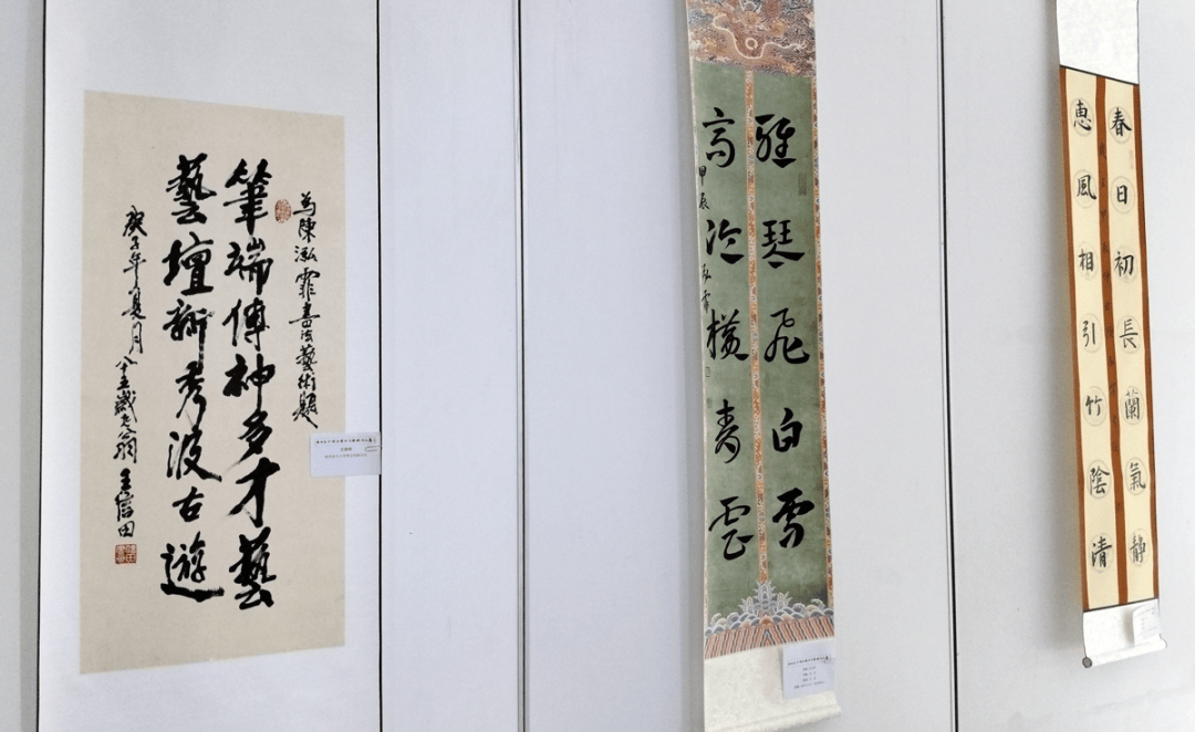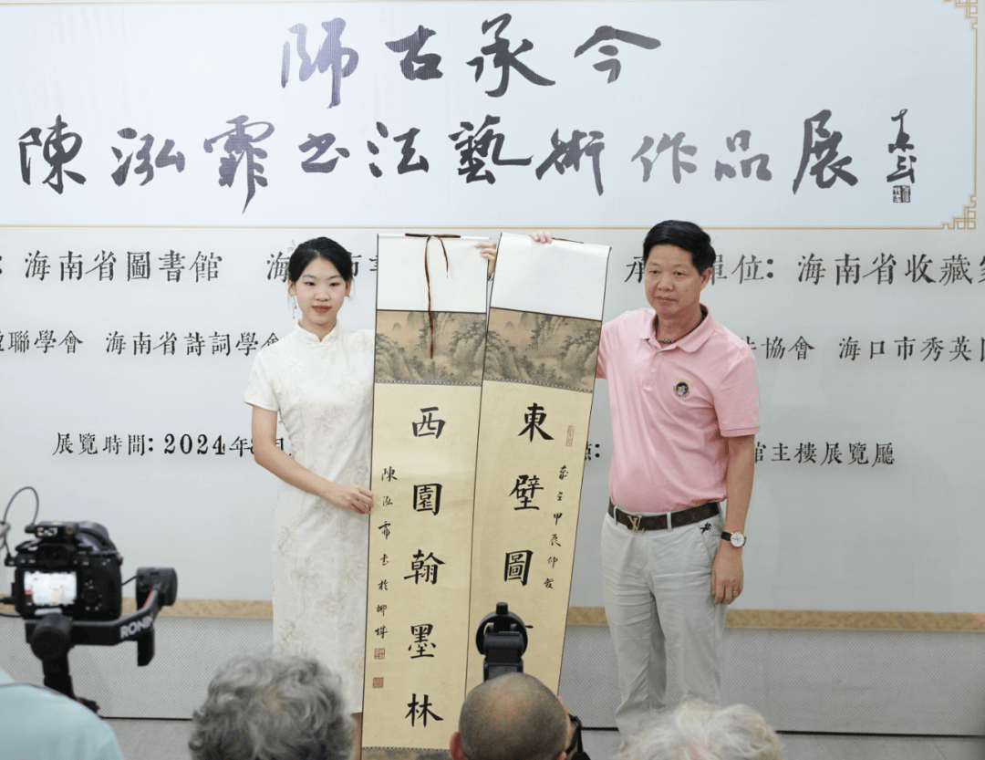 展览作者陈泓霏向主办单位海南省图书馆捐赠精心创作的汉隶书法作品《宋词元曲明书画 晋字唐诗汉文章》、章草书法作品《吐艳丹青皆有意 流香翰墨自多情》
