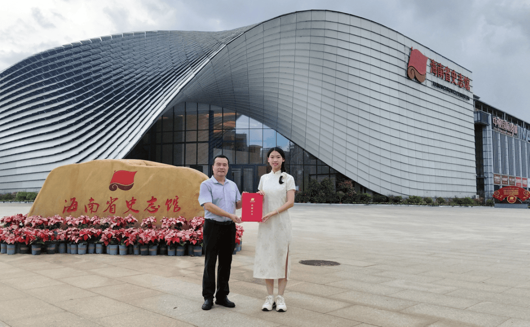 海南省史志馆馆长游宪军接收作品并向陈泓霏颁发海南省史志馆的捐赠收藏证书