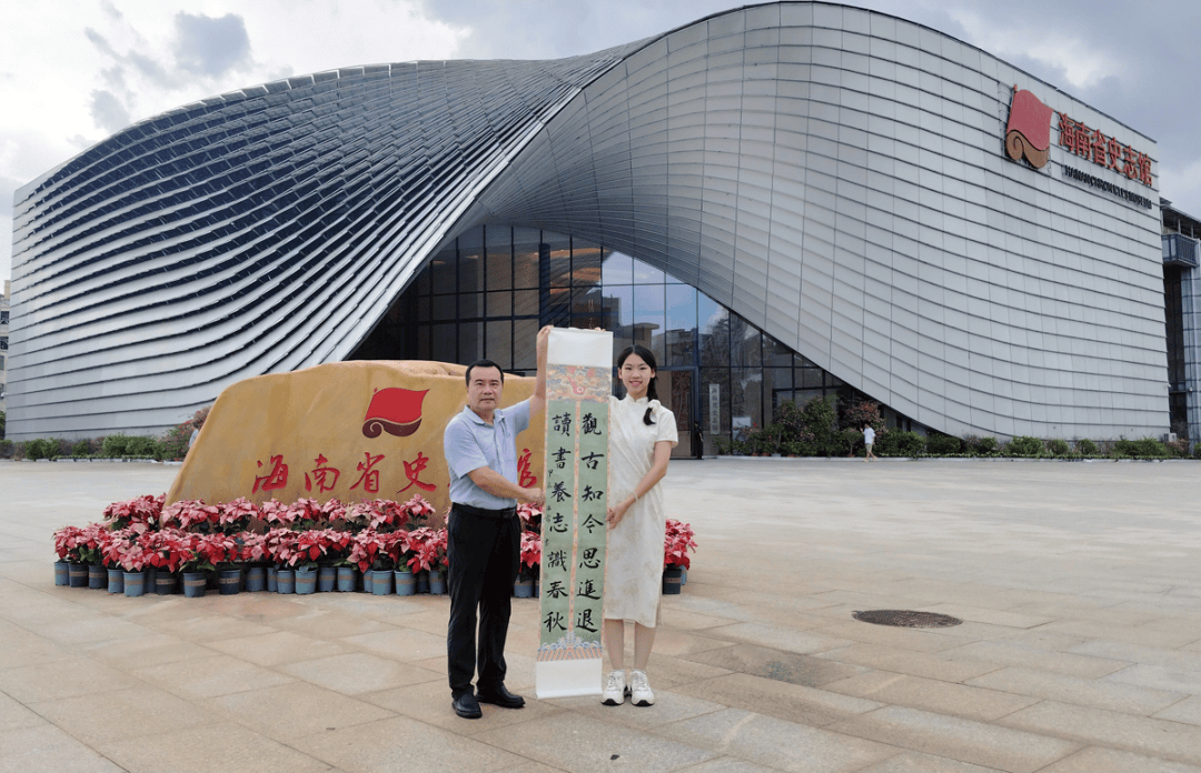 展览作者陈泓霏向海南省史志馆捐赠精心创作的行书条幅书法作品《观古知今思进退 读书养志识春秋》